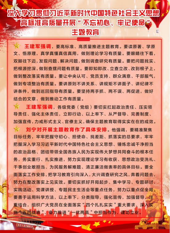 由集团党委副书记、总经理刘玲同志宣读《集团党委开展"不忘初心、牢记使命"主题教育实施方案》。集团党委书记、董事长王玉辉同志作了"不忘初心、牢记使命"主题教育动员讲话,对集团系统开展主题教育工作进行了安排部署,要求把主题教育与完成本单位转型升级、项目建设、生产经营等工作任务结合起来,切实把主题教育成果转化为企业发展的强大动力,推动青海物产高质量发展。省委"不忘初心、牢记使命"主题教育第十二巡回指导组组长任正德同志做了指导讲话。充分肯定了集团党委的前期工作,认为会议准备比较充分,有效统一了干部职工的思想,制定的主题教育《实施方案》操作性强,目标任务具体,动员讲话政治站位高,思想认识深,工作思路清晰。同时,结合工作组的职责就落实主题教育各项任务讲了六点意见。一是聚焦根本任务;二是把握"十二"字总要求;三是紧扣"五句话"总目标;四是落实"四个贯穿";五是抓实"六项重点"举措;六是力戒形式主义,严禁主题教育走形式、走过场。